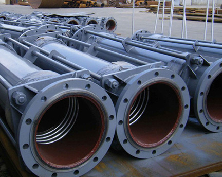 特點:橫向大拉桿波紋管膨脹節(jié)由中間管所連接的兩個波紋管及拉桿、端板和球面與錐面墊圈等結(jié)構(gòu)件組成,主要吸收橫向位移,也可用于補償軸向、橫向、角向以及由這三種形式合成的任意方向的位移。推薦使用將復(fù)式拉桿型膨脹節(jié)安裝在呈90°的Z形管道的中間短管臂內(nèi)以補償兩端長管線軸向位移。